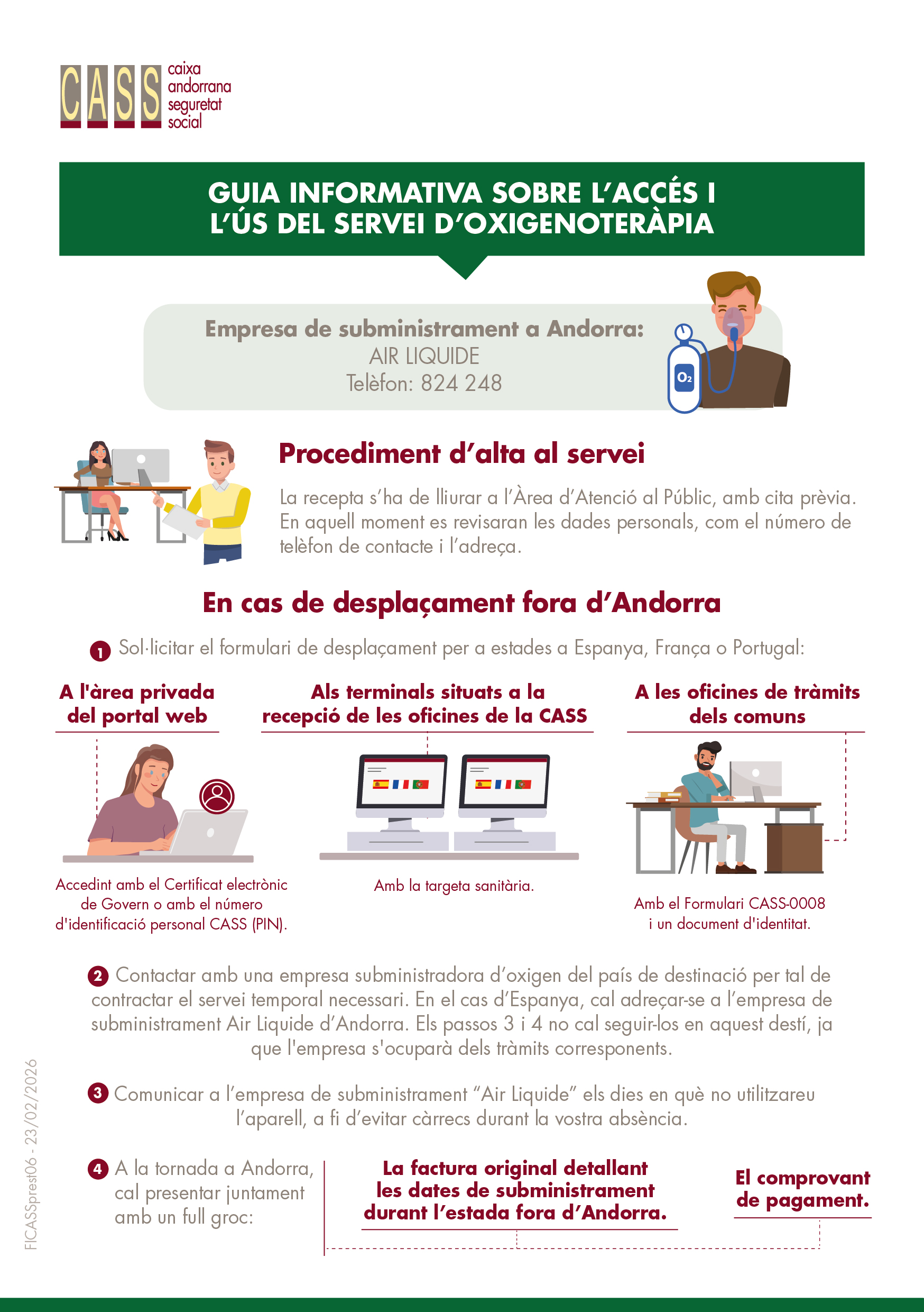 - Contactar amb una empresa subministradora d'oxigen del país de destinació per tal de contractar el servei temporal necessari. En el cas d'Espanya, cal adreçar-se a l'empresa de subministrament Air Liquide d'Andorra. Els passos 3 i no cal seguir-los en aquest destí, ja que l'empresa s'ocuparà dels tràmits corresponents.