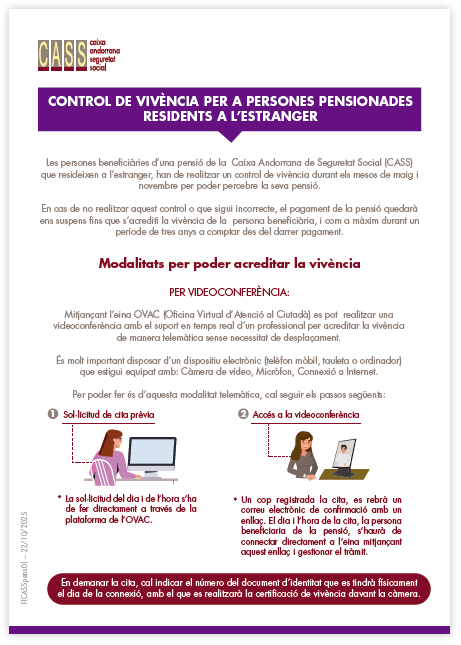 Les persones beneficiàries d'una pensió de la Caixa Andorrana de Seguretat Social (CASS) que resideixen a l'estranger, han de realitzar un control de vivència durant els mesos de maig i novembre per poder percebre la seva pensió.