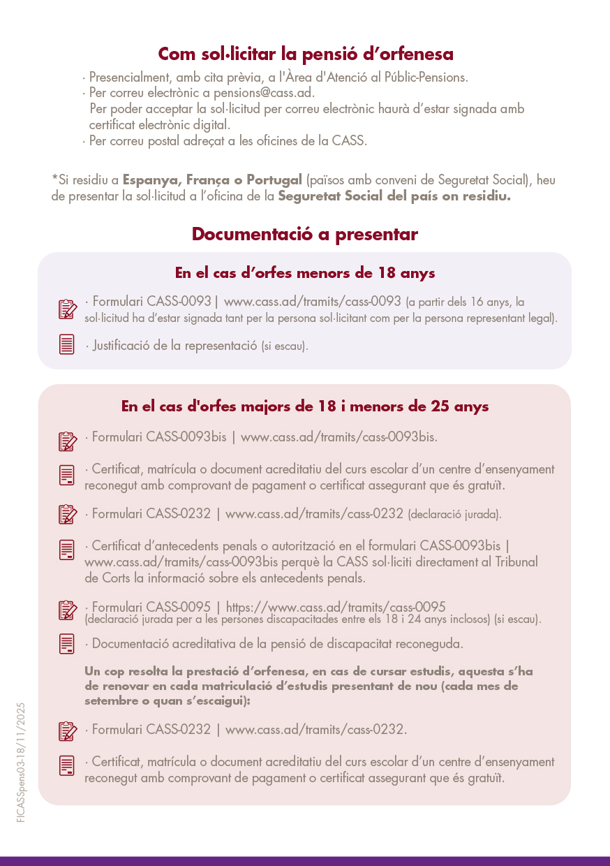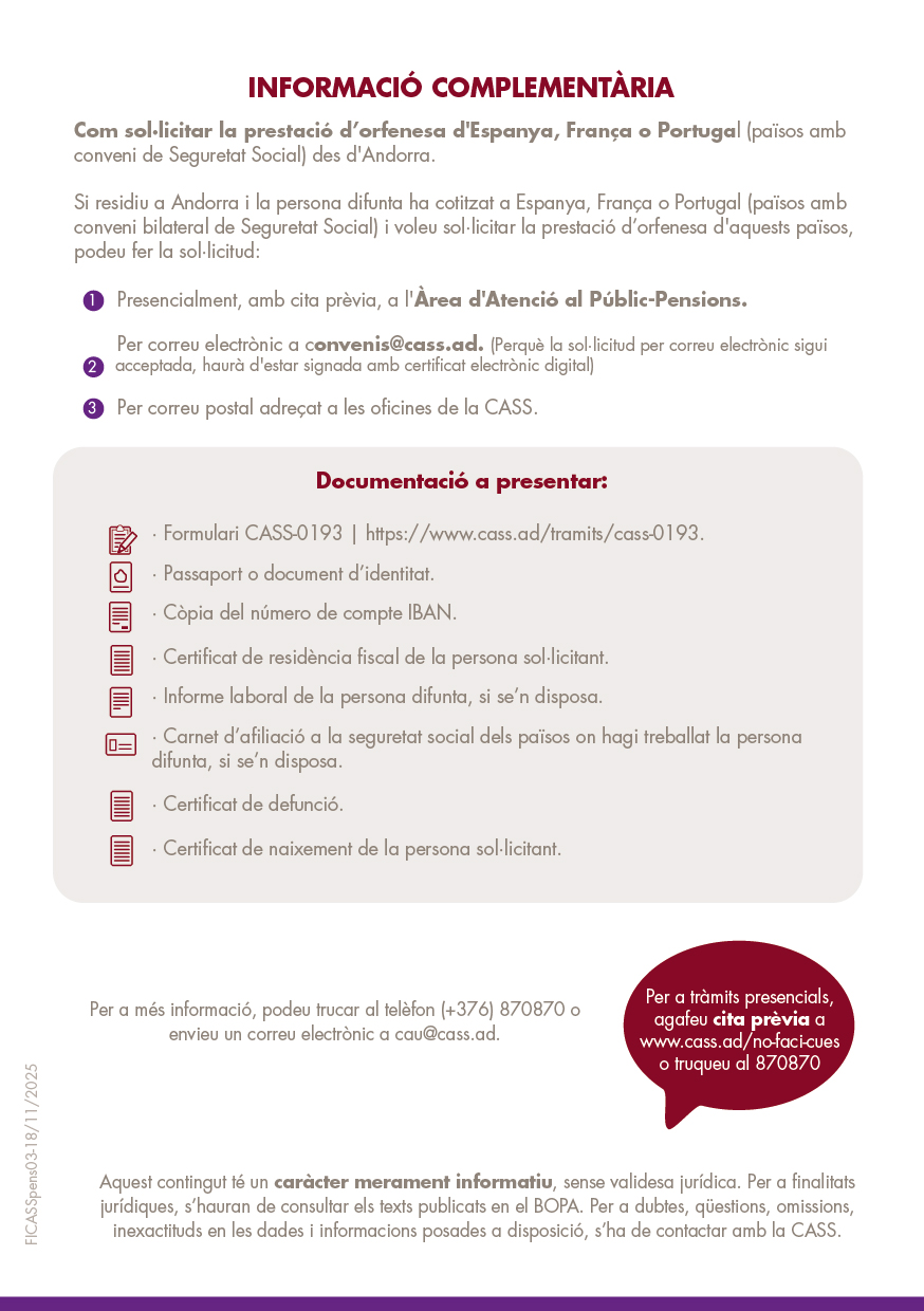 Informació complementària per com sol·licitar la pensió d'orfenesa d'Espanya, França o Portugal (països amb conveni de Seguretat Social) des d'Andorra