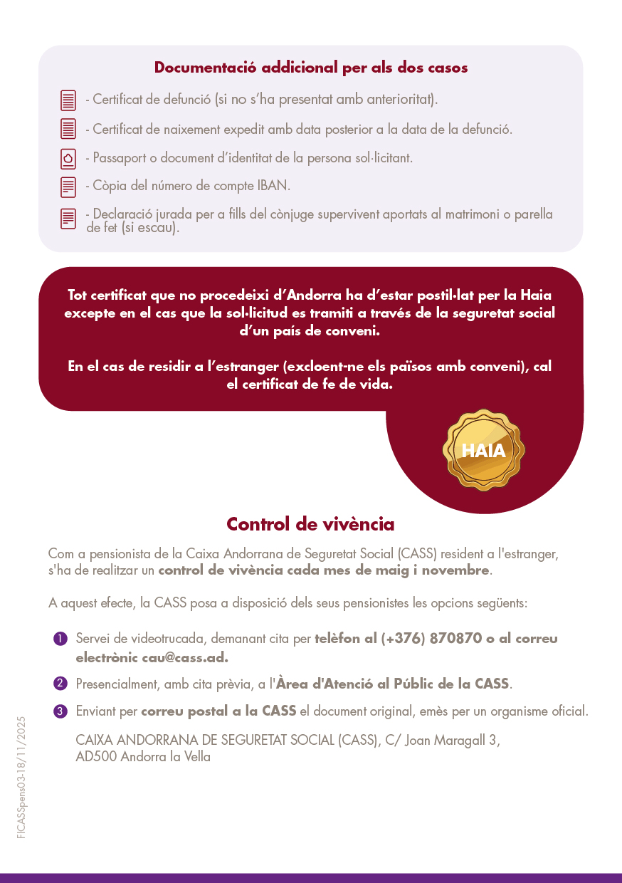 En el cas de residir a l'estranger (excloent-ne els països amb conveni), cal el certificat de fe de vida.