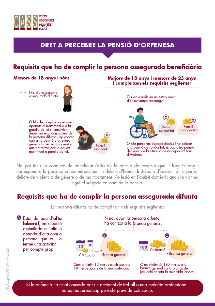 Si la defunció ha estat causada per un accident de treball o una malaltia professional, no es requereix cap període previ de cotització. - Si no, també es genera el dret a la pensió d’orfenesa quan la persona difunta no compleix aquests requisits generals, però ha cotitzat a la branca general com a mínim 12 mesos en els darrers 18 mesos abans de la seva defunció o un mínim de 180 mesos a la branca general i a la branca de jubilació en tota la seva vida laboral.