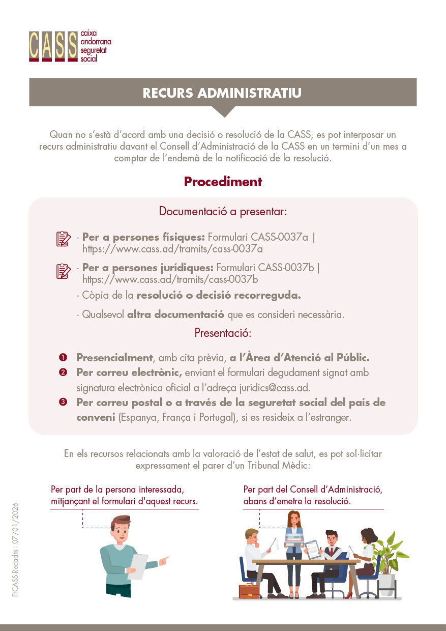 Quan no s'està d'acord amb una decisió o resolució de la CASS, es pot interposar un recurs administratiu davant el Consell d'Administració de la CASS en un termini d'un mes a comptar de l'endemà de la notificació de la resolució.