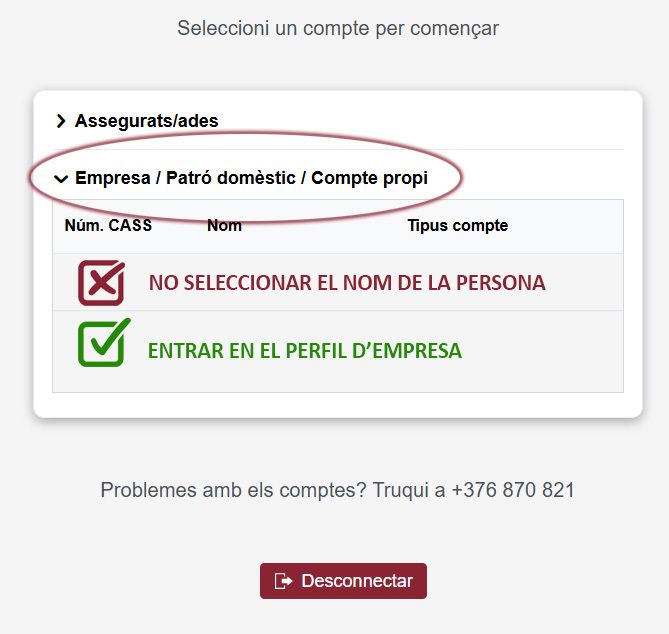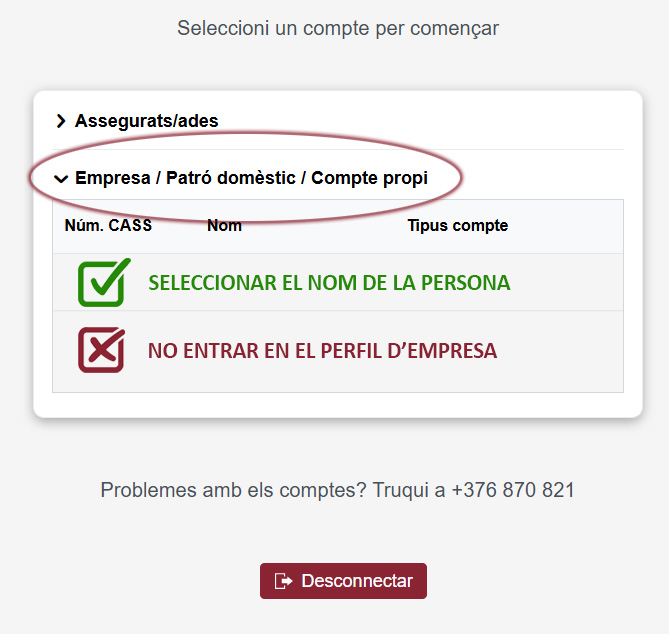Si disposeu del Certificat Electrònic de Govern o del número d’identificació personal de la CASS (PIN), podeu consultar i modificar de manera immediata les vostres dades personals a través de l'Àrea Privada del portal web de la CASS. A continuació, us mostrem els passos a seguir. Un cop us heu identificat, cal escollir el perfil de navegació i el nom de l'empresa (no entrar en el perfil de persona física).